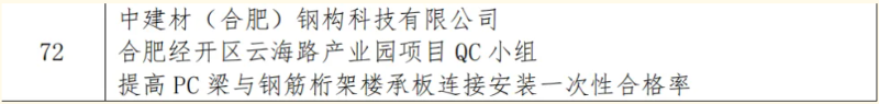 本次競賽旨在深入貫徹落實《質量強國建設綱要》精神,引導鋼木建筑行業企業科學運用先進質量管理方法,全面提升工程質量管理水平。全國各地眾多鋼木建筑企業踴躍參賽,競爭異常激烈。公司高度重視此次競賽,精心組織內部質量管理小組進行成果申報。最終,公司多個質量管理小組的項目成果在一眾參賽作品中成功突圍。其中,合肥經開區云海路產業園項目QC小組的“提高 PC 梁與鋼筋桁架樓承板連接安裝一次性合格率”課題榮獲二等獎。該成果聚焦鋼桁梁底部作業難題,通過技術創新,大幅提高了施工效率與安全性,為業內同類工程提供了極具價值的實踐范例。此外,中建材鋼構公司還有6項成果榮獲三等獎,獲獎成果覆蓋鋼結構制造、安裝以及施工工藝優化等多個領域,均是公司質量管理小組在實際工程項目中,運用科學方法,深耕技術創新與質量改進工作的結晶。
